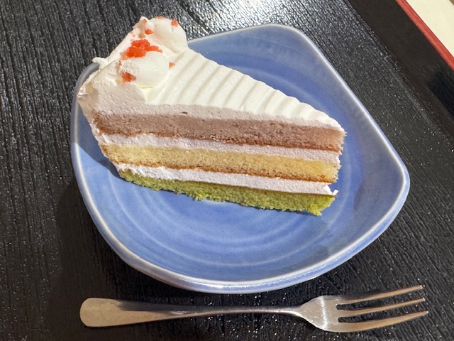 おやつはひしもちをイメージした3色ケーキの提供でした。ハーモニーのご利用者様はケーキが好きな方が多く